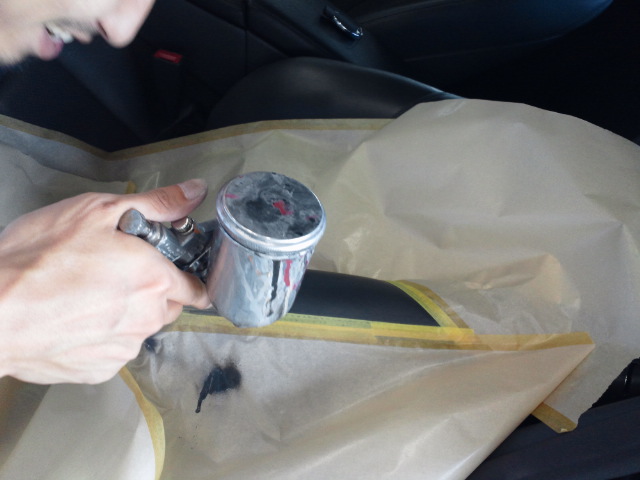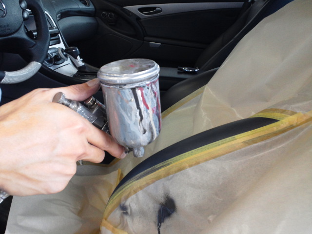 そしてマスキングを施しガンで吹き付けていきます。色、艶を見ながら調整していきます。周りの革と同じ質感を出さないといけません。馴染んでくれないと補修箇所だけ浮いてしまうので気をつけます。